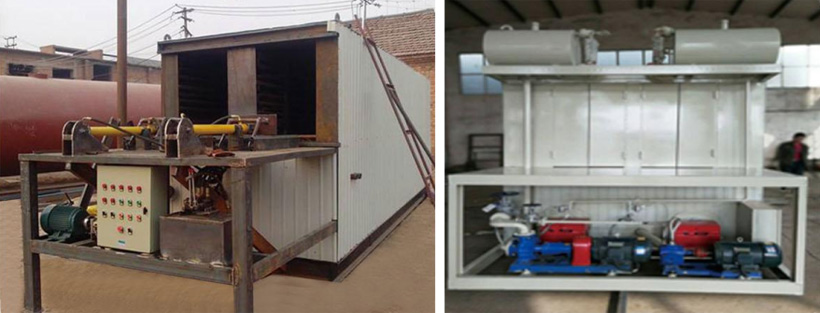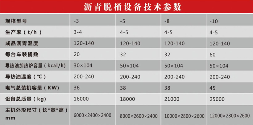 瀝青脫桶裝置外配燃油或燃煤導熱油爐加熱,通過加熱盤對瀝青進行加熱、熔化、脫桶。主要由脫桶箱體、起吊機構、推進器及電器控制系統等部件組成。箱體分上下兩室,上室為瀝青熔化室,密布導熱油加熱盤管,瀝青受熱熔化從桶中脫出;起吊機構安裝在龍門架上,懸掛有抓桶器,通過電動卷揚機將瀝青桶提起,再橫向移動將瀝青桶放在導軌上,然后由推進器通過兩條導軌將桶推入上室,同時后端出口處頂出一只空桶。瀝青桶入口處設有防滴油槽。瀝青進入箱體下室繼續加熱,使溫度達到約100 °C以上可以輸送,然后由瀝青泵泵入瀝青罐,下室也可作為瀝青加溫罐使用。